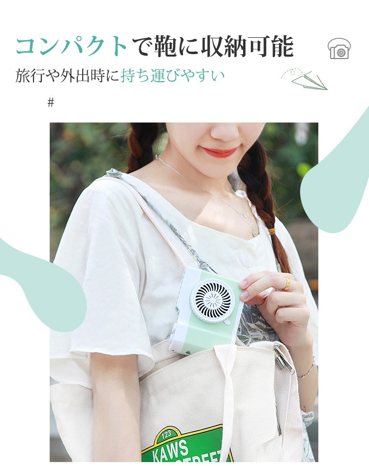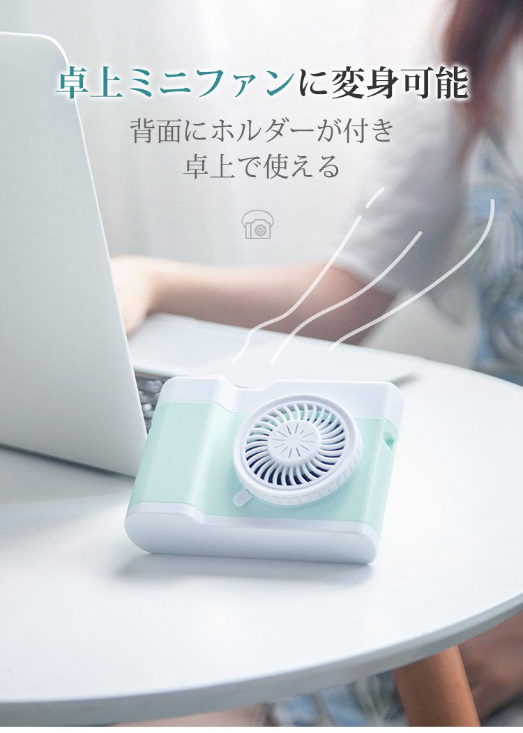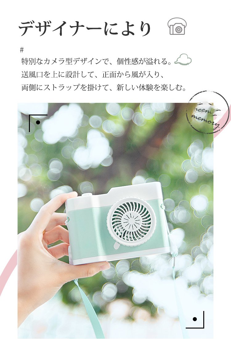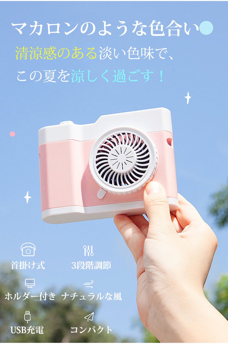 【カメラ型ミニファン】USB充電、長時間稼動、3段階調節、コンパクト、ワンボタン操作、静音性デザイン、首掛け・手持ち・卓上に使用可能